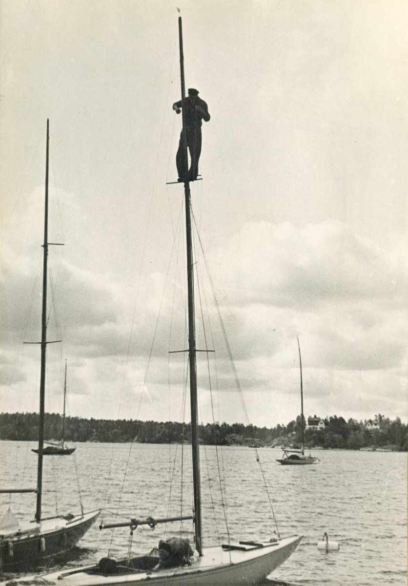 Fotografi ur Detlow von Brauns album. Seglare arbetar uppe i masten. Segelbåten ligger i hamn.