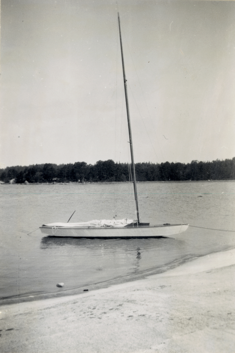 Fotografi ur Detlow von Brauns album. Segelbåt Starbåten REDSTAR förtöjd i naturhamn.