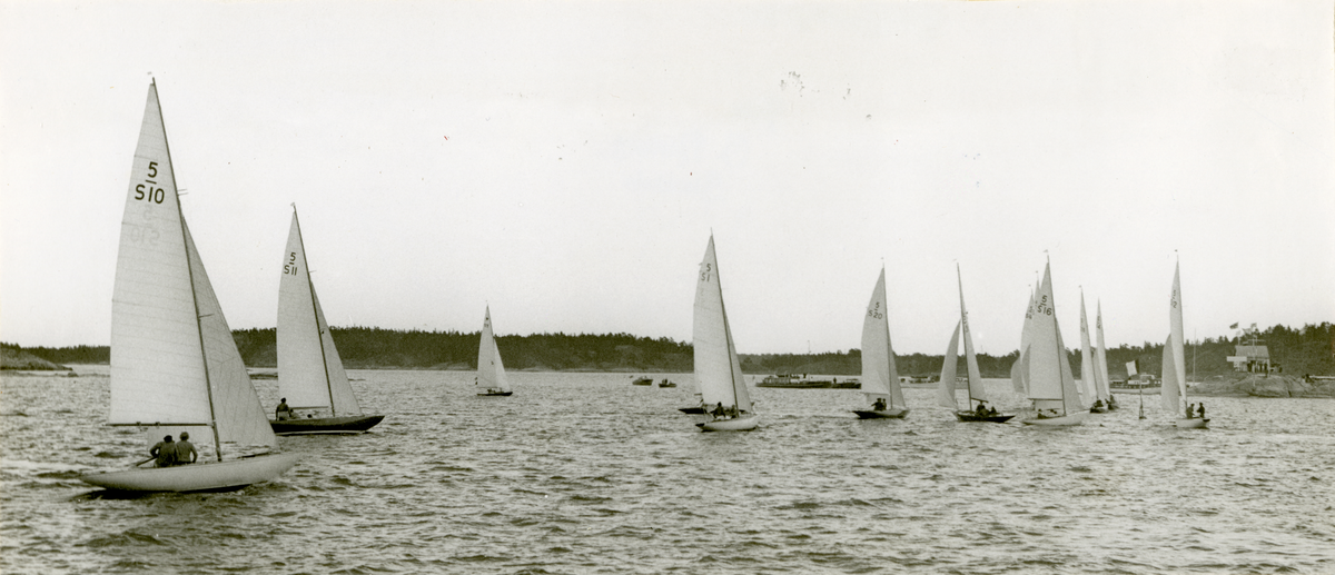 Fotografi ur Detlow von Brauns album. Kappsegling på Kanholmsfjärden. Segelbåtarna 5-S10, 5-S11, 5-S1, 5-S20, 5-S16, 5-S14, 5-S12 och flera kapplseglar.