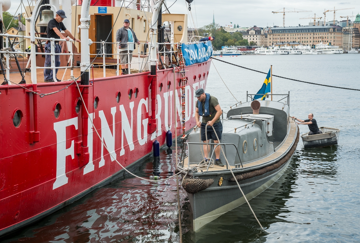 Ångslup 45 sjösätts, bogseras av Bernhard Ingelsson till Galärvarvet.