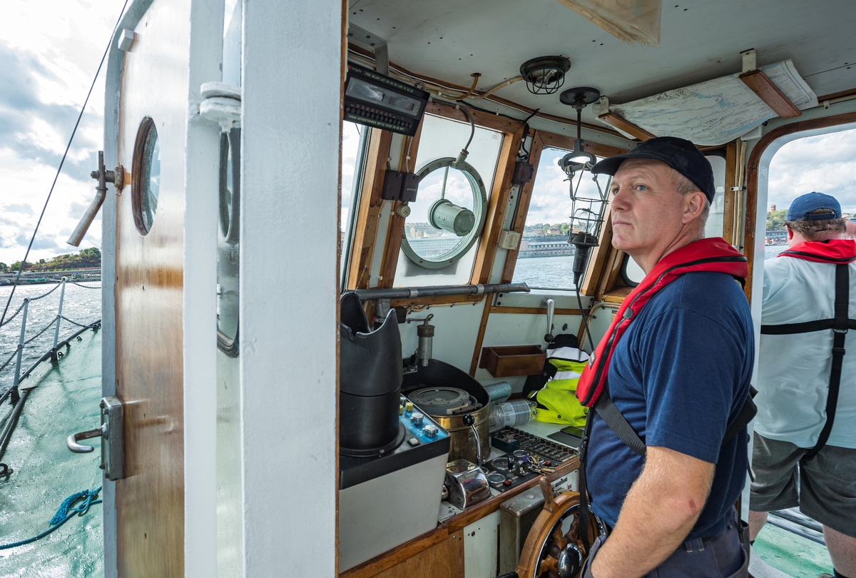 Ångslup 45 sjösätts, bogseras av Bernhard Ingelsson till Galärvarvet.