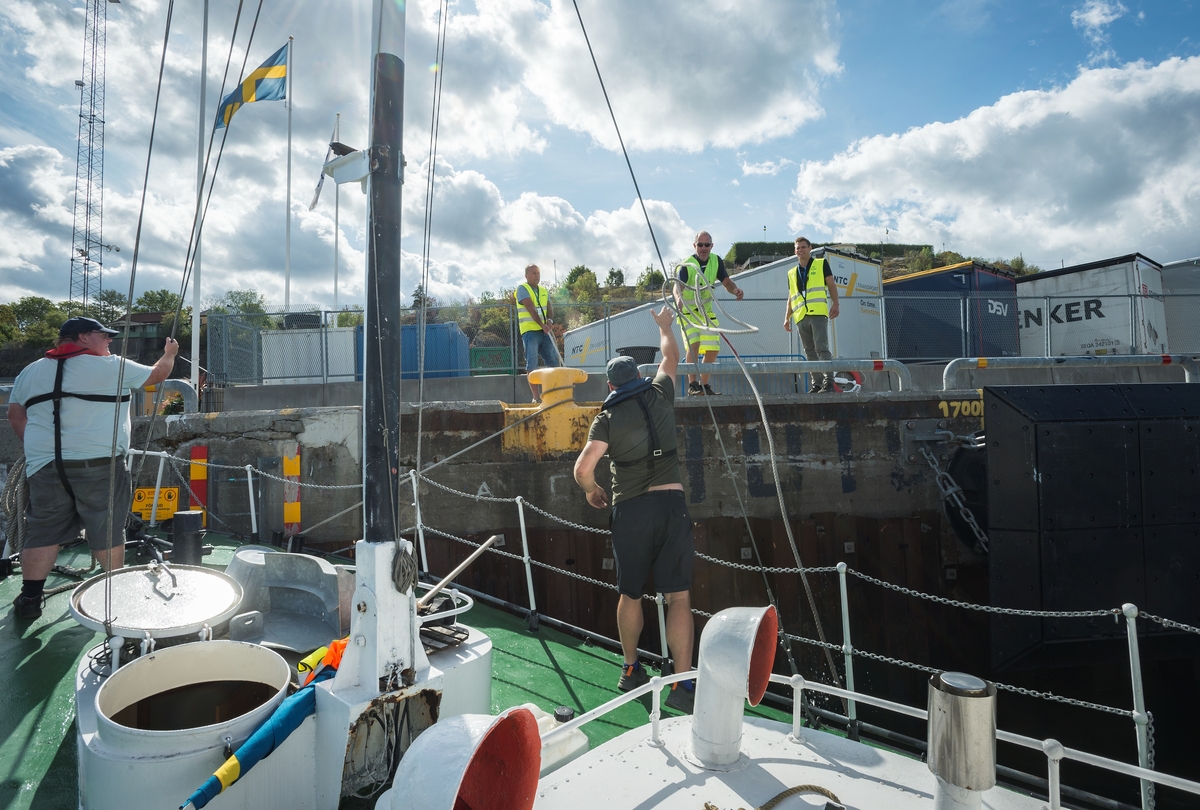 Ångslup 45 sjösätts, bogseras av Bernhard Ingelsson till Galärvarvet.