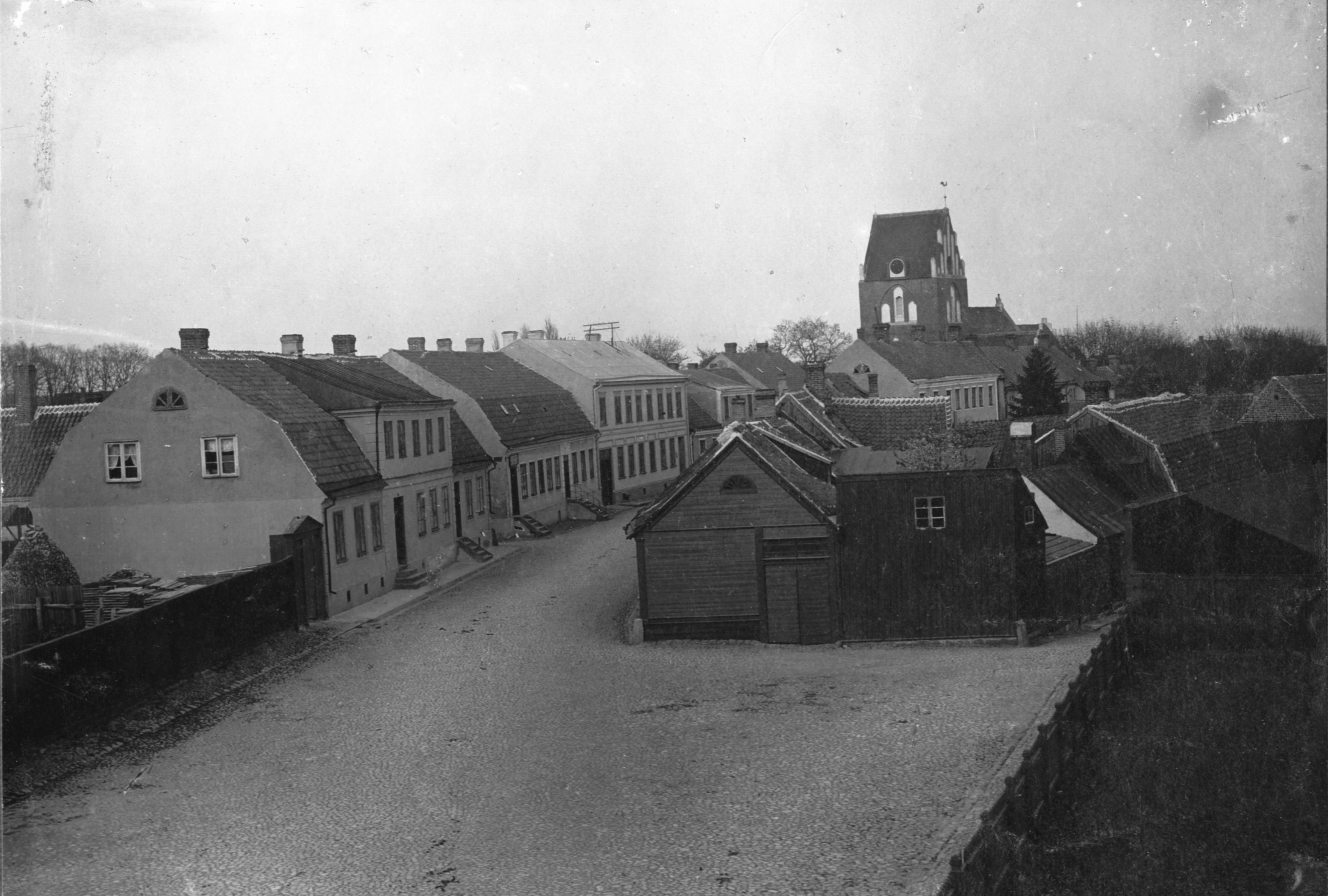 Kyrkan med omkringliggande bebyggelse. Västra Storgatan med kvarteret Pantern till vänster. Kvarteret Uttern till höger.