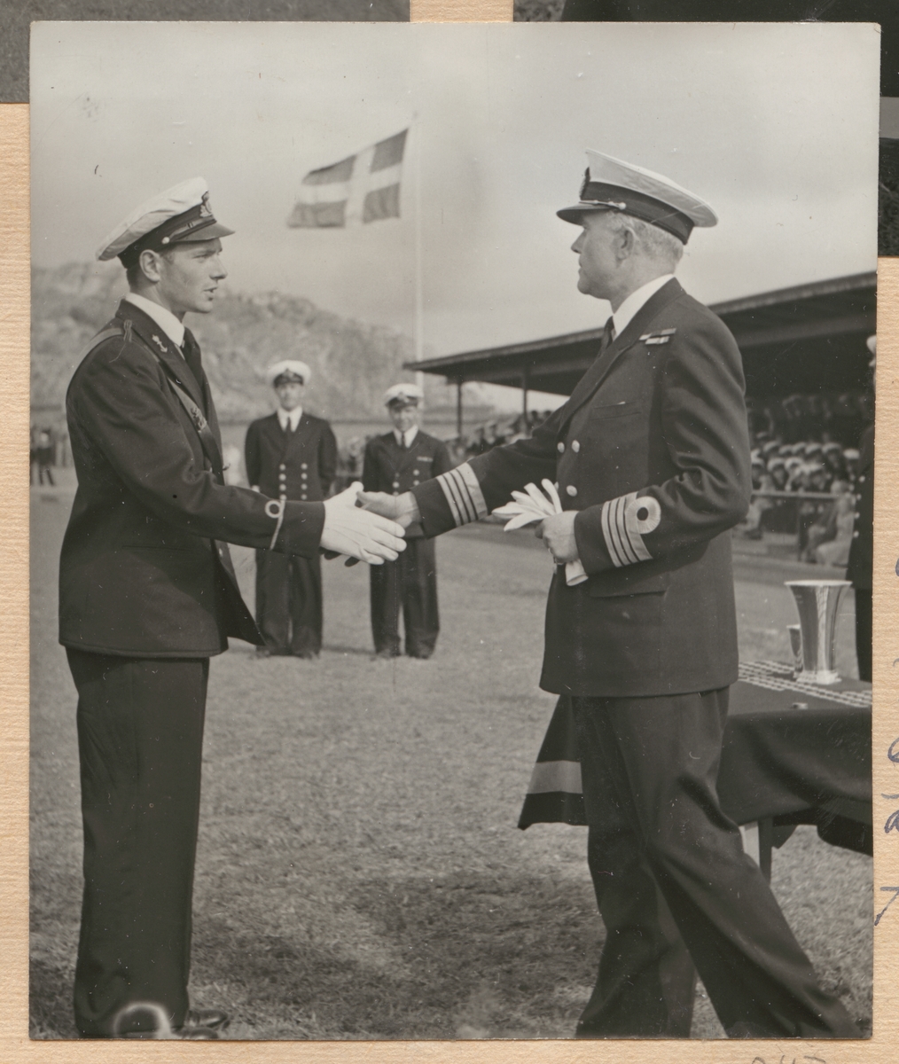 Även i friidrott vann vår södra granne, Danske lagledaren en flaggkadett tackar kommendör Forshell för det fina priset.