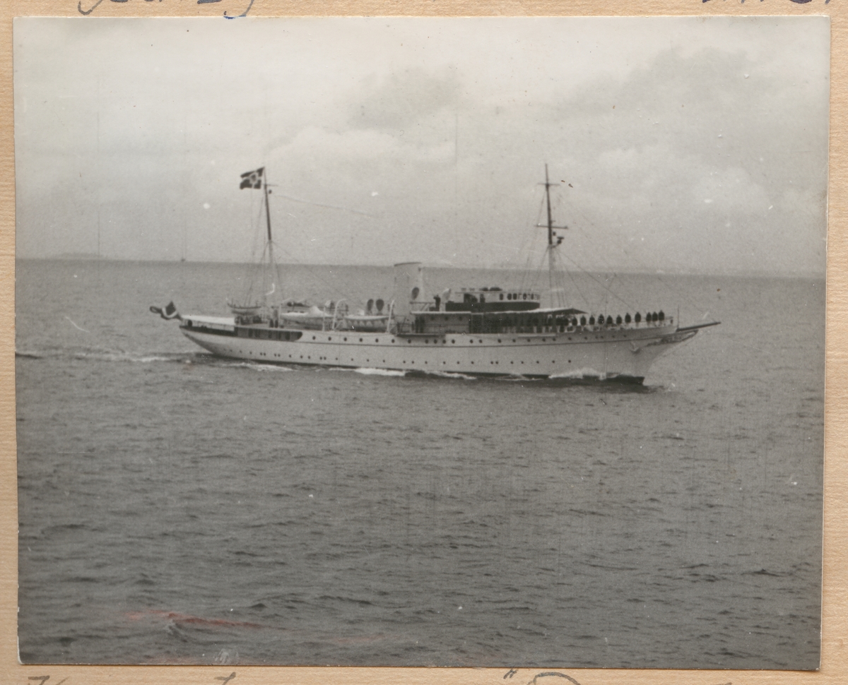 Kung Fredrik kommer ombord i Öresund. Kungen klommer med "Dannebogen" och saluteras givetvis.