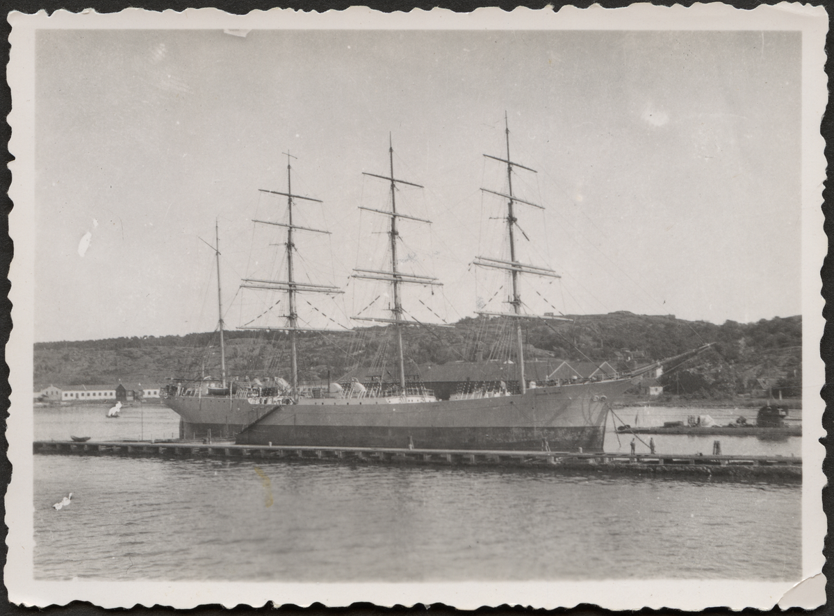 Bilden visar en fyrmastad bark som ligger förtöjt vid en brygga.