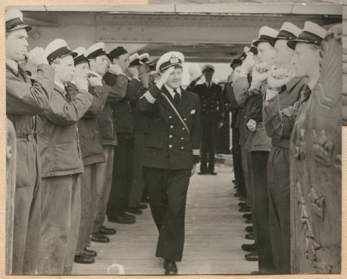 Vi är åter hemma i Sverige. I Göteborg debarkerar vår förträfflige fotoofficer. Musikkåren spelar och 14 kadetter "blåser över". Omöjligt misstaga sig på populariteten.
