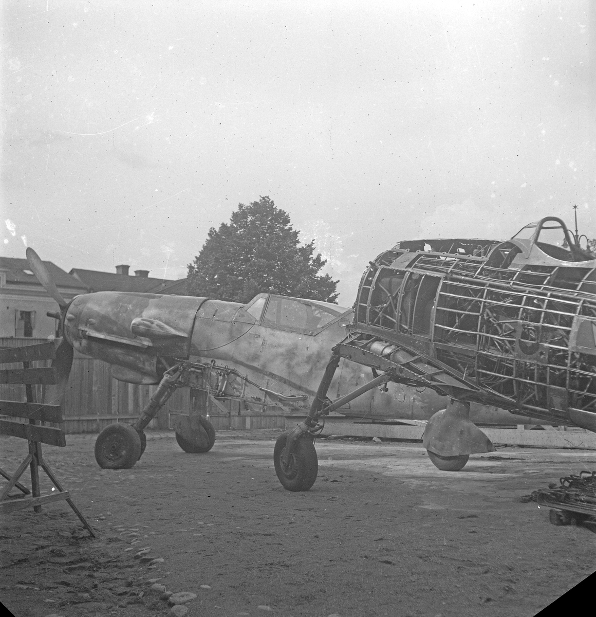 Bilden visar två delvis demonterade flygplan typ Messerschmitt BF 109.