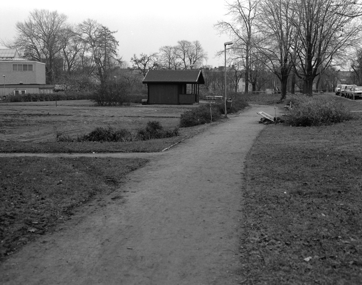 Museiparken i Linköping i en tid av förändring. Ytan har börjat röjas för etableringen av bygget som ska uppföra stadens nya konserthus. Vy mot öster från en position utmed Konsistoriegatan nära korsningen av Östgötagatan. I bildens vänsterkant ses en skymt av Östergötlands museum och i fonden husraden längs Gråbrödragatan. December 1984.
