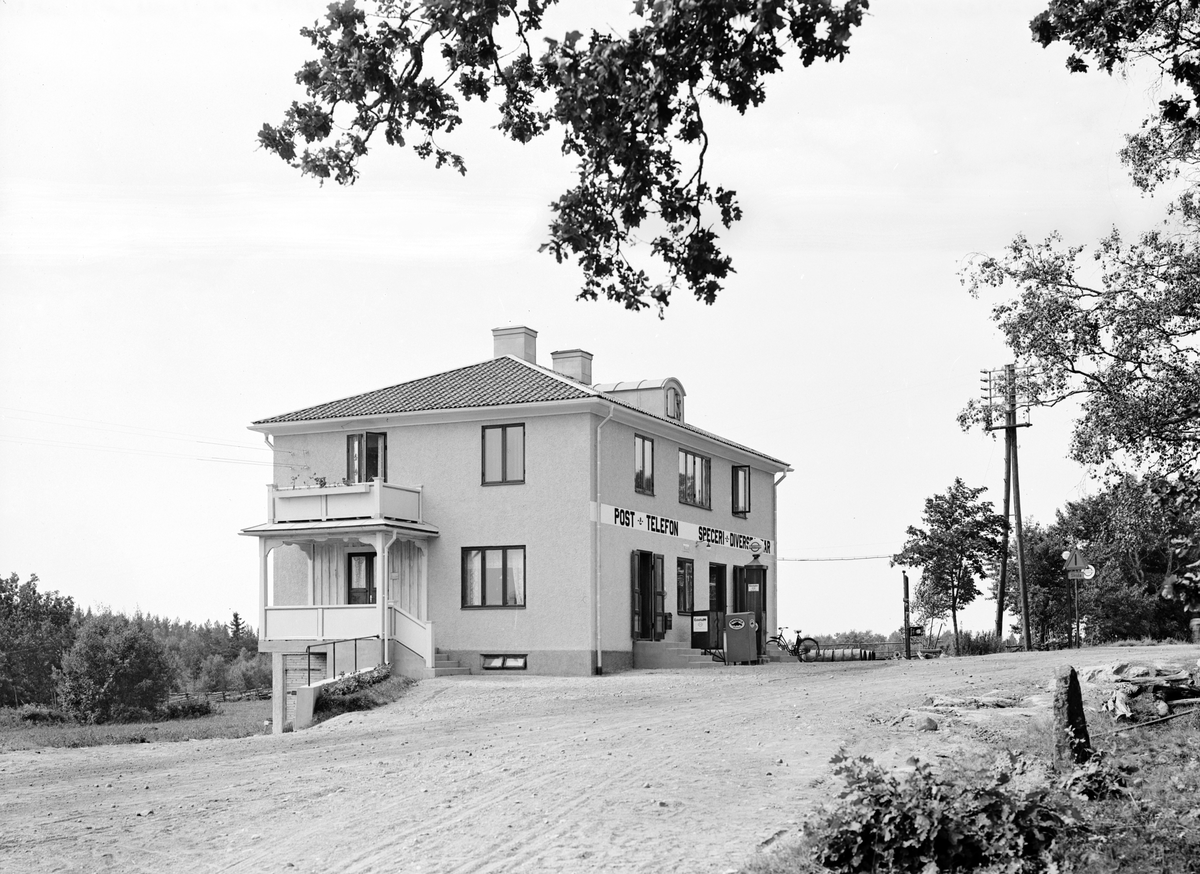 Åkerslund i Svinhult. Uppförd som bostads- och affärshus 1934 med den tillhandahållna servicen tydligt angiven på fasaden. Odaterad bild som uppskattas ha tillkommit nära husets färdigställan. Vi skriver omkring 1940.