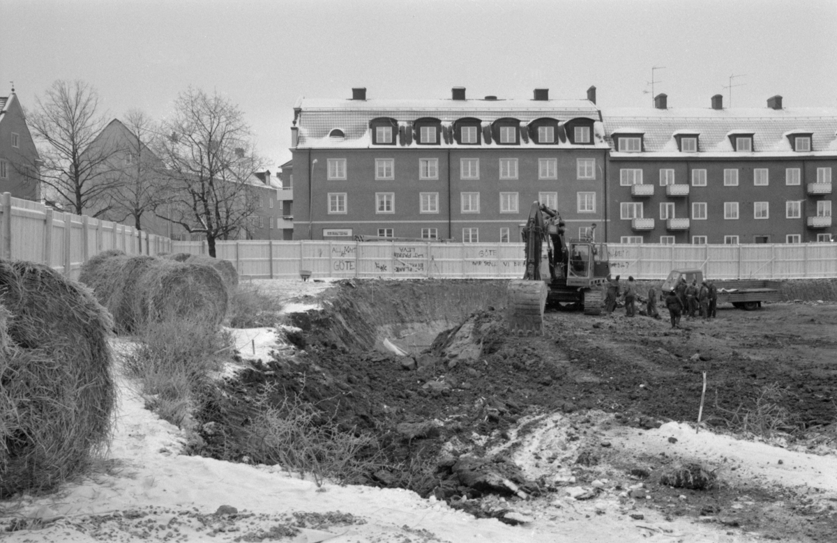 En lång och infekterad fråga har nått vägs ände. Schaktningsarbetet för Linköpings nya konsert- och kongressbyggnad var i januari 1985 i full gång. Protesterna hade dock inte tystnat och planket runt byggarbetsplatsen skulle komma att bli en händelsenära arena för missnöjesyttringar. Vy mot Östgötagatan.