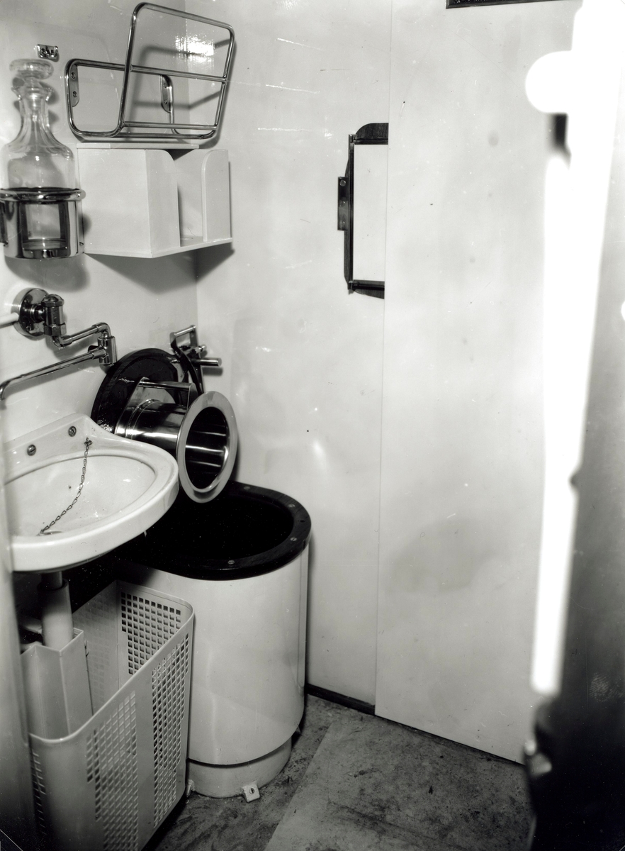 Ett toalettrymme på en tågvagn, som tillverkats av Kalmar Verkstads AB.