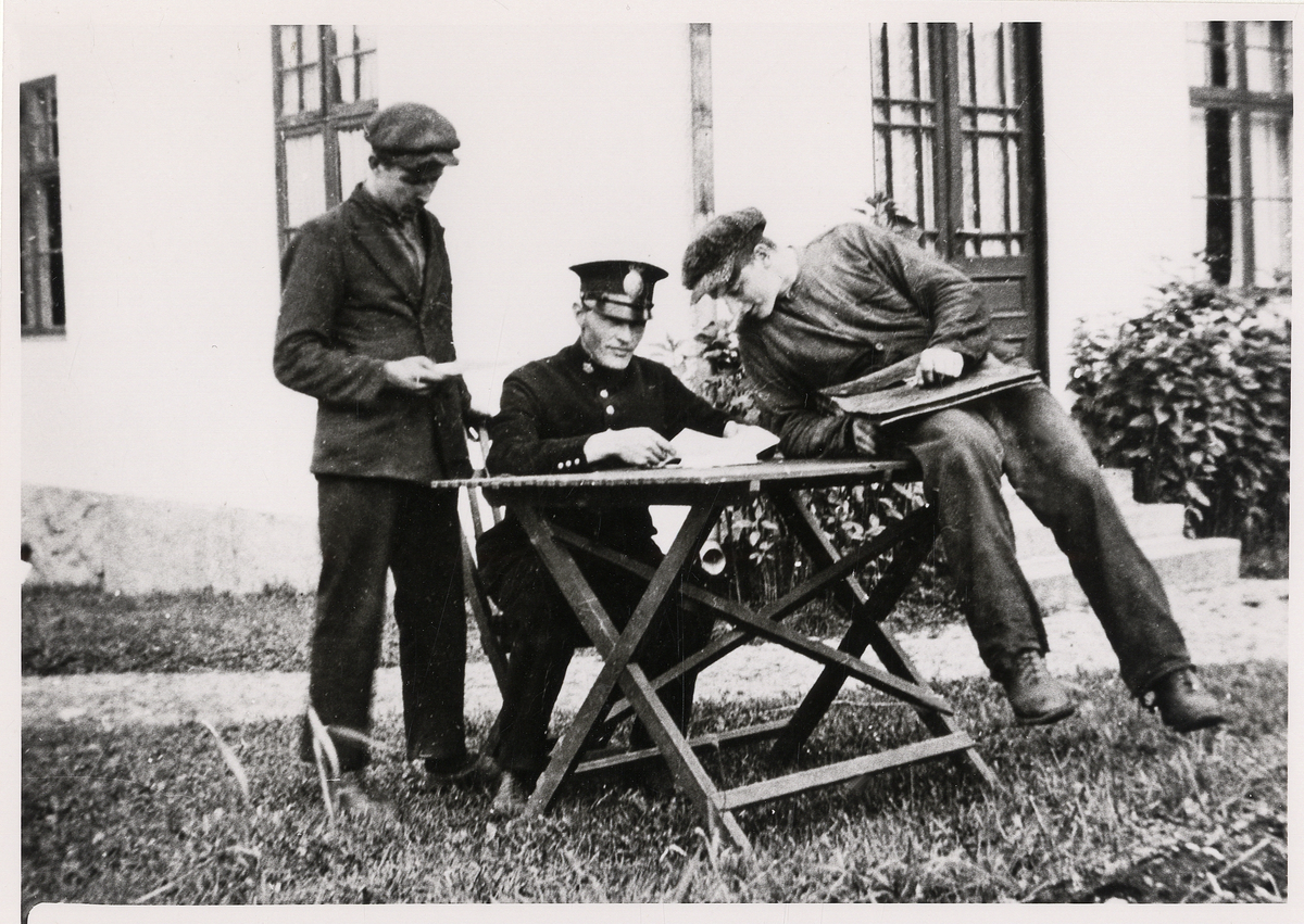 Fjärdingsman Olaus Andersson i arbete vid ett trädgårdsbord, någonstans i Alvesta, ca 1930-32.