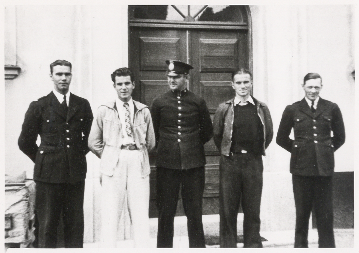 Alvestapoliser tillsammans med två flyktingar utanför polisstationen i Alvesta, ca 1943.