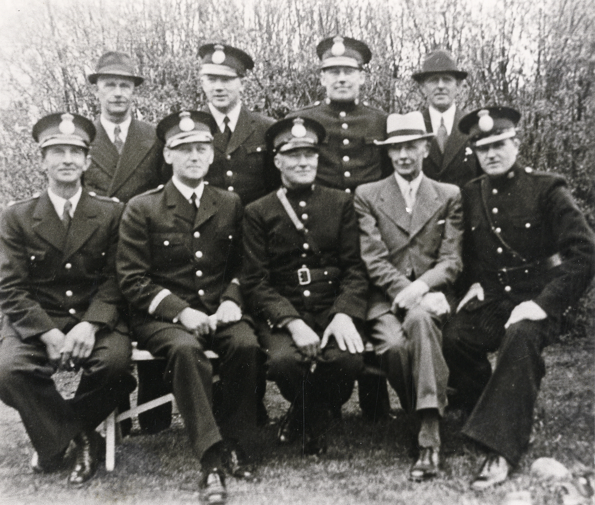 Främre raden fr.v.: Oscar Alexandersson, Långasjö, landsfiskal Gustaf Larsson, August Franzén, Skruv, skrivbiträde Erik Rehn, Axel Stenlund, Älmeboda.