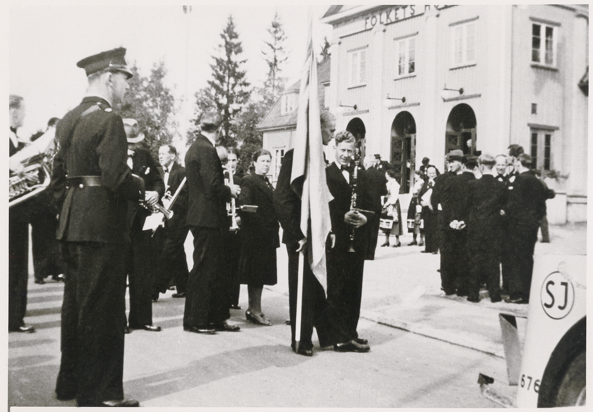 Lessebo bruk jubilerar, 1943. Festtåget samlas utanför Folkets Hus i Lessebo. Till vänster syns poliskonstapel