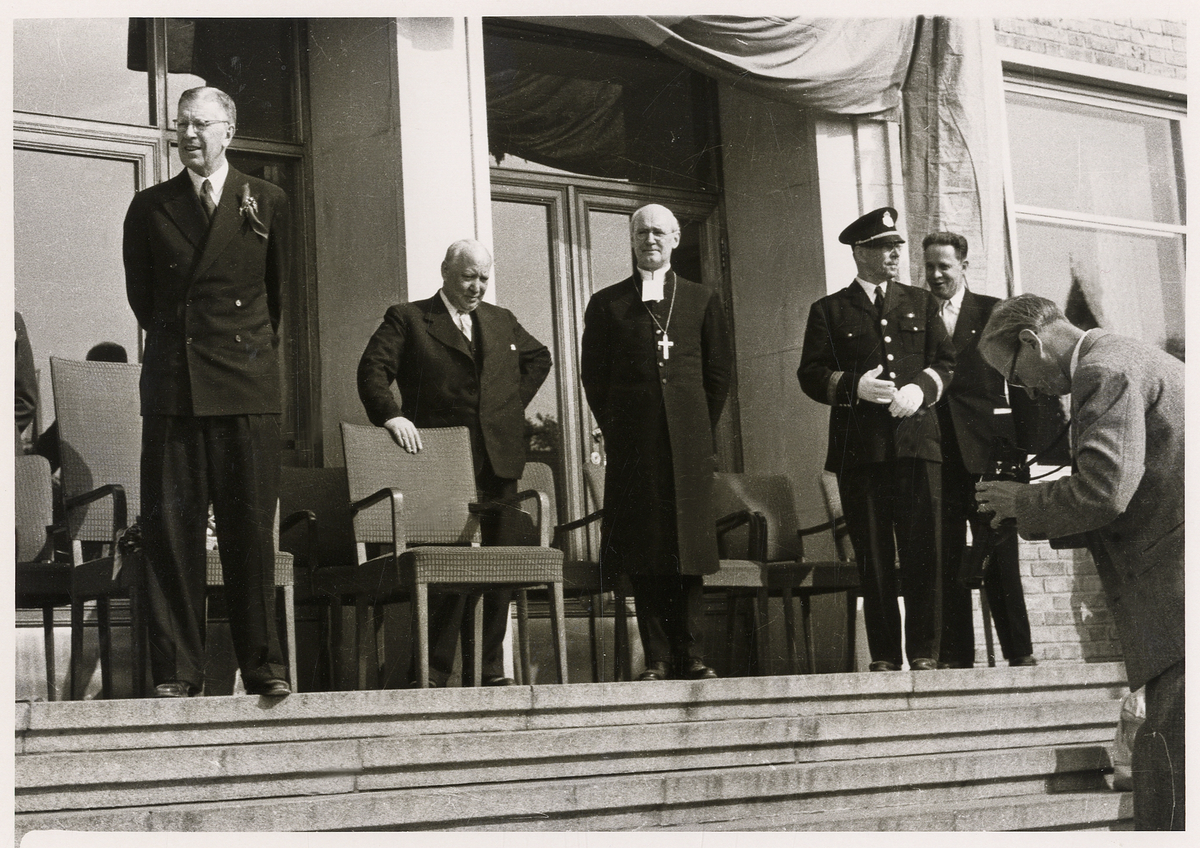 Kungabesök (Gustaf VI Adolf) 1954. Kungen avvaktar. Till höger syns landshövding Thorwald Bergqvist, biskop Elis Malmeström, landsfogde Baltzar Vult von Steyern och landsantikvarie Jan Erik Anderbjörk.