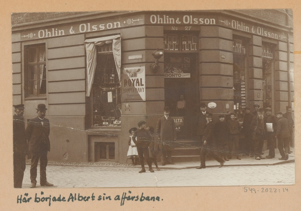 Exteriört fotografi av affärsverksamheten Ohlin & Ohlsson på Kullagatan 27. Utanför står vuxna och barn.