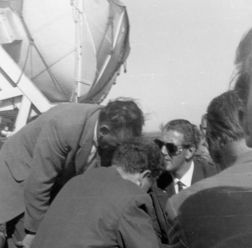 Svartvitt fotografi av fyra män som står på däck på en färja. Männen står nära varandra som i en ring och tittar inåt och neråt, förutom en av dem som bär solglasögon. Han har huvudet i en neutral vinkel och ser ut att titta frakt framför sig istället. Två av de andra männen ser man enbart rygg och nacke på. Mannen längst till vänster i bild ser man snett från sidan. Bakom och ovanför honom syns en ljus livbåt i sin ställning på färjans däck.