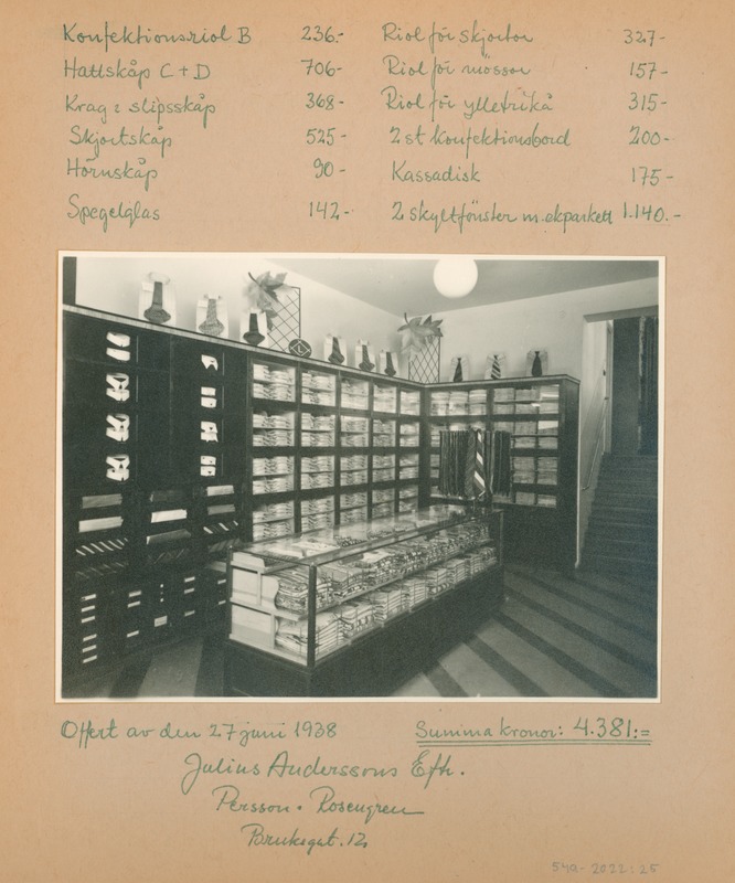 Interiört fotografi av Henses herrekipering på Södra Storgatan 13. Ovanför fotografiet står kostnader för inredningen och under att offerten gavs den 27 juni av Julius Anderssons efterträdare Pesson och Rosengren. Sammanlagd summa 4.381 kronor.