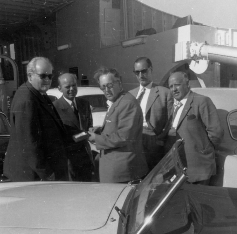 Svartvitt fotografi av fem män som står på bildäcket på en färja. Förgrunden utgörs av en bit av en cabriolet med nedfällt tak. På andra sidan den, inåt i bilden, står männen samlade i en ring. Samtliga är iklädda kostym och tre av dem har solglasögon. Alla tittar mot kameran. Mannen i mitten ser ut att ha snurrat ett halvt varv för att titta mot fotografen. Han håller en öppen ask i sina händer. Möjligen är detta en cigarrlåda eller cigarettetui. Bakom männen syns fler bilar och delar av själva färjan.