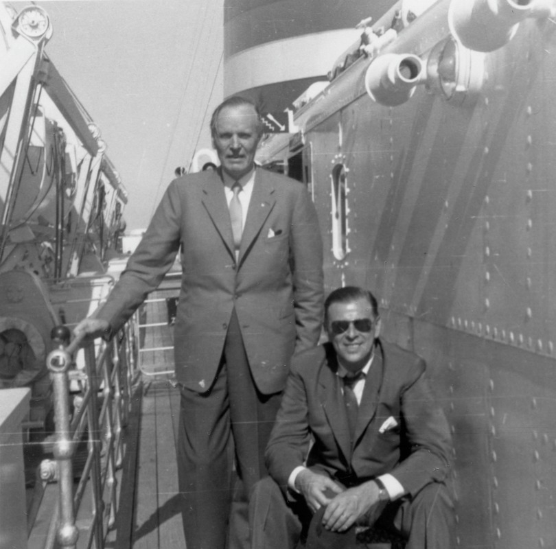 Svartvitt fotografi av två män som på däck på en färja. Männen är placerade ungefär mitt i bilden. Intill dem, åt höger i bild, finns en relativt låg ljus, metallvägg med ett litet fönster. På andra sidan om dem, åt vänster i bild, löper ett metallräcke bakåt, inåt i bild. Mannen som står lite åt vänster i bild håller kring räcket med sin högra hand. Snett framför honom, lite åt höger, sitter den andre mannen på någonting intill väggen. Han har solglasögon på sig och ser stort. Båda är iklädda kostym. Längst åt vänster i bild, bakom staketet, och lite upphöjt, syns tre livbåtar på rad i sina ställningar. Bakom männen syns även andra delar av färjan.