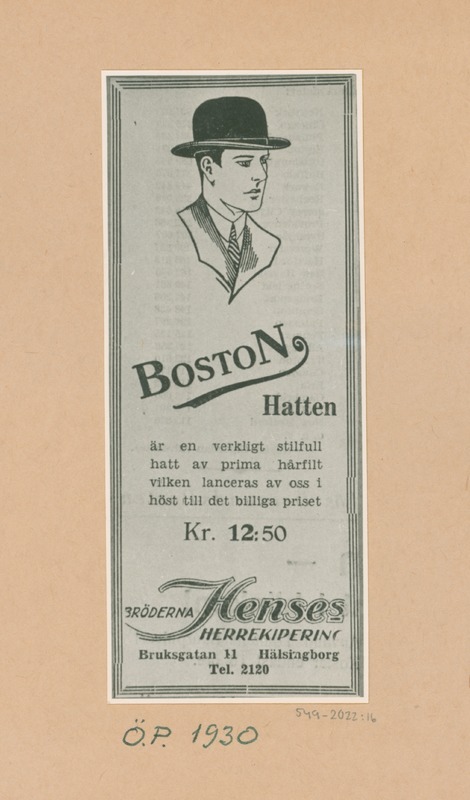Avfotograferad annons för Bröderna Hensens herrekipering på Bruksgatan 11, publicerad i Öresundsposten 1930. "BOSTON Hatten..."