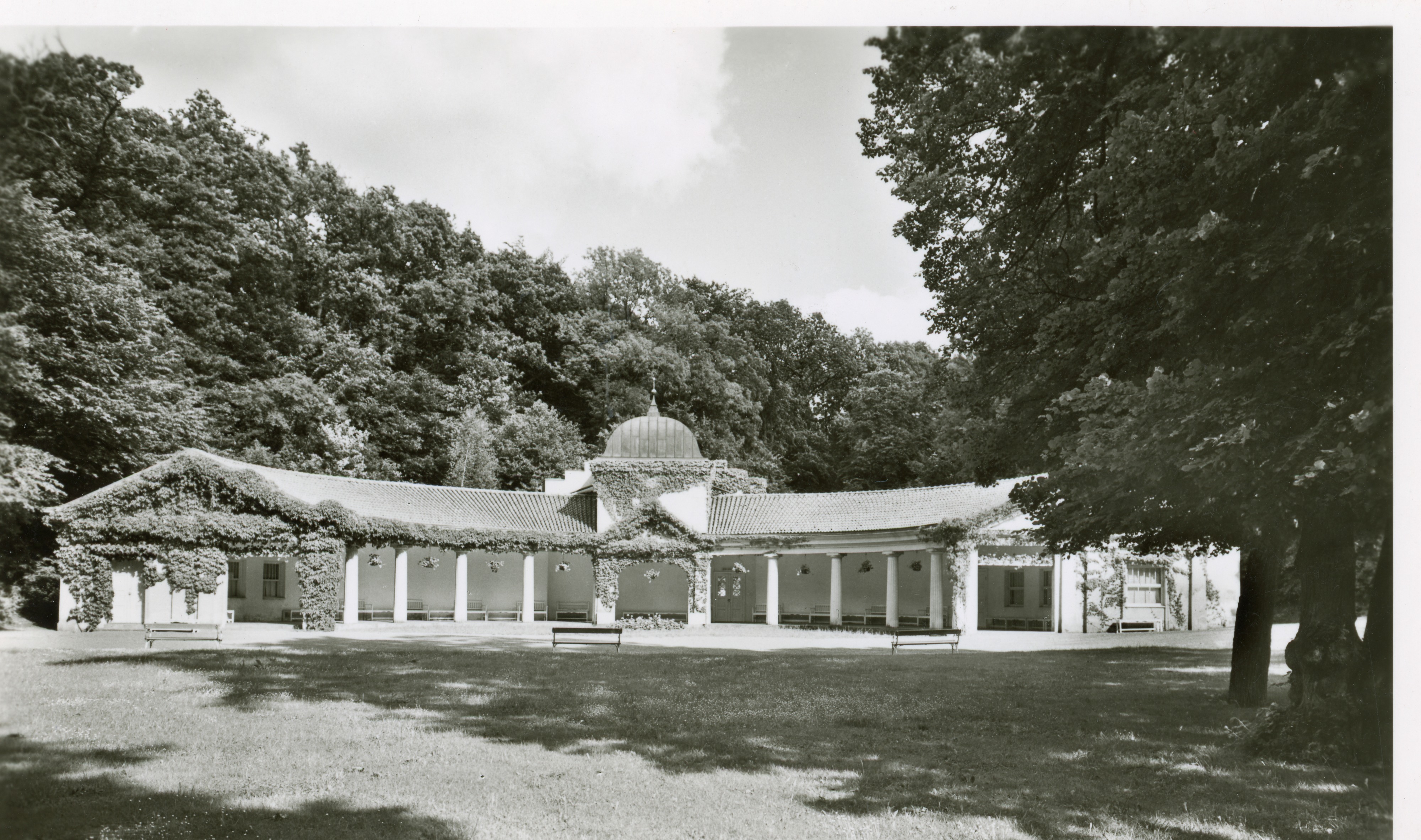 Bilden föreställer i bakgrunden Ramlösa brunn, Pelarhallen. I förgrunden gräsmatta och träd. Bakom pelarhallen också träd.