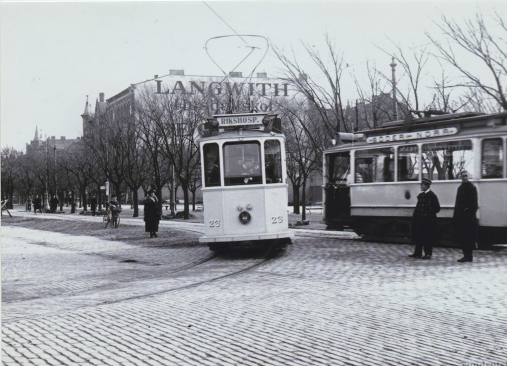 Svartvitt fotografi föreställande en spårvagn fotograferad framifrån med skylten "Rikshosp.". Till höger står två män, en klädd i uniform med hatt och bakom kör en spårvagn med skylt "Söder-Norr". I bakgrunden syns en byggnad med texten "Langwith". Fotograferat vid korsningen Hälsovägen-Drottninggatan.