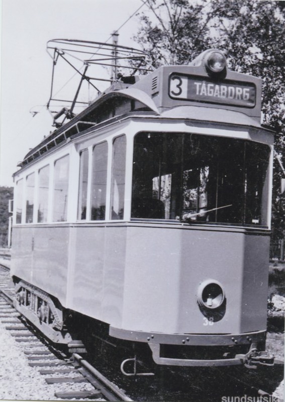 Svartvitt fotografi föreställande spårvagn linje 3 Tågaborg. Fotografiet är taget snett framifrån.