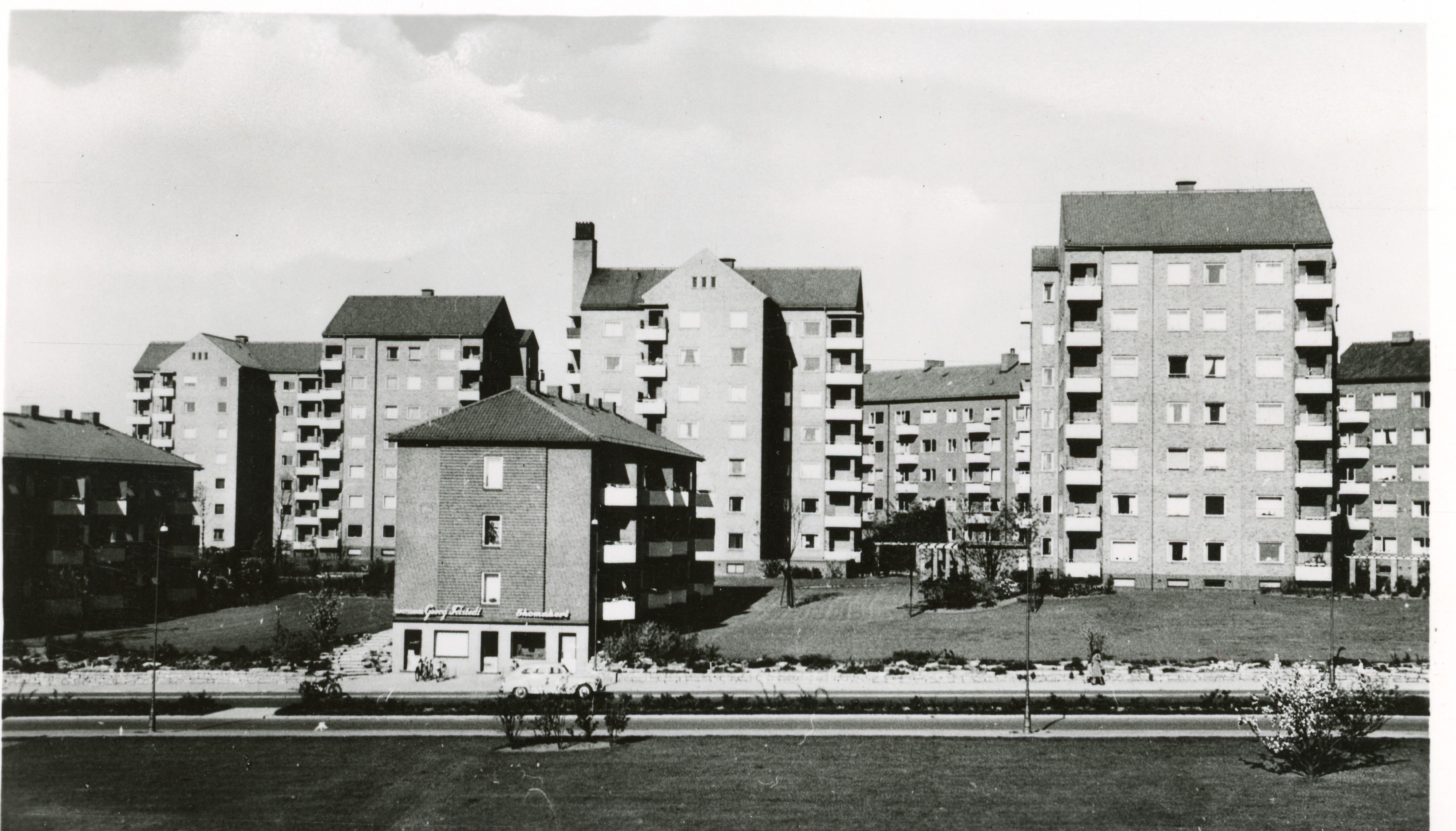 Bilden föreställer ett område med sjuvåningshus och ett par trevånings. I förgrunden gräsmatta och stadsgata samt enstaka buskar. På bilden står det Hälsingborg, parti från Slottshöjden.