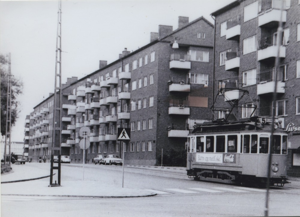 Svartvitt fotografi föreställande en spårvagn som kör på Rektorsgatan i Helsingborg. Spårvagn nr 5. På spårvagnen finns Coca Cola reklam. i bakgrunden syns lägenhetsbebyggelse.