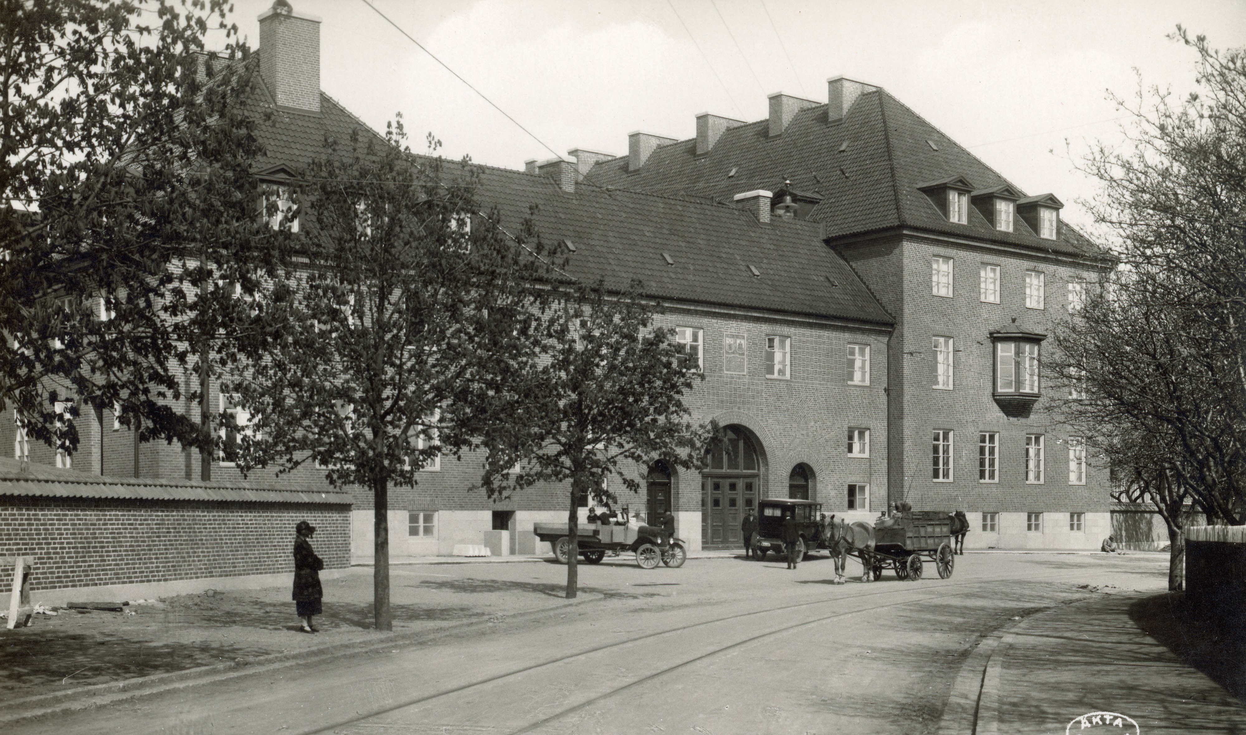 Bilden föreställer Helsingborgs Lasarett i bakgrunden. I förgrunden stadsgata med bilar och hästtransport. Vid sidorna trottoarer och träd.