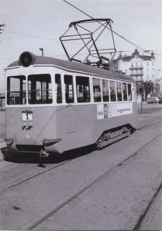 Svartvitt fotografi föreställande spårvagn linje 1 som kör på Järnvägsgatan i Helsingborg. Fotografiet är taget snett framifrån.