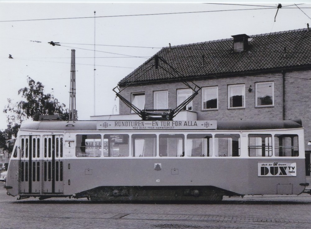 Fotografi föreställande en spårvagn fotograferat från sidan. Vagnen står utanför en tegelbyggnad och har en skylt med texten "Rundturen - En tur för alla. Med oss från Hamntorget".