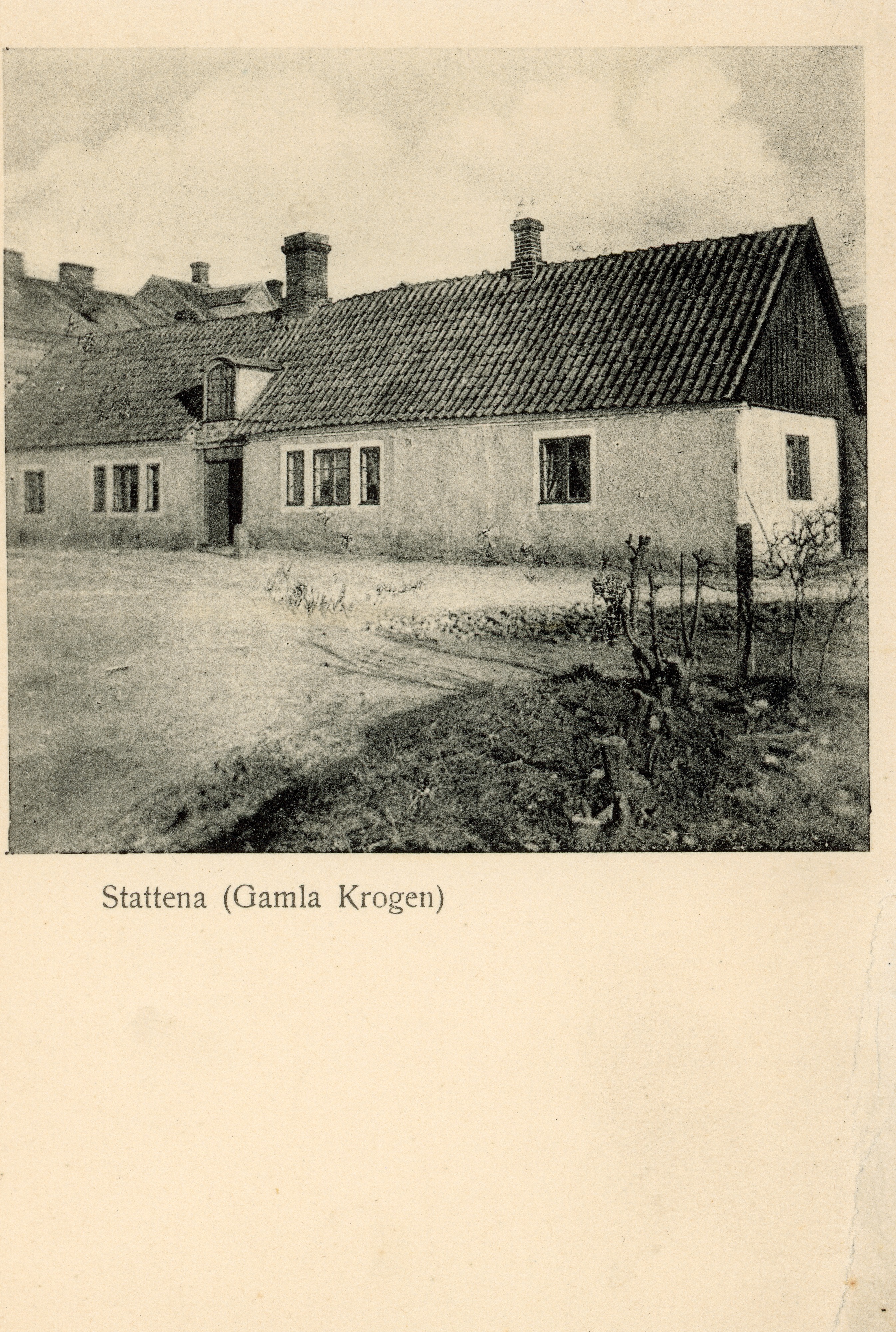 Bilden föreställer ett långt enplanshus med öppen gårdsplan framför. Till höger gräsmark med buskar.