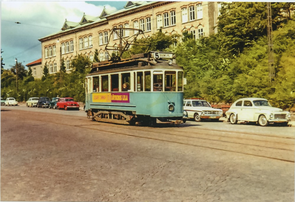 Fotografi föreställande spårvagn som kör troligtvis vid Bergaliden. Linje 5 S:t Jörgens Plats. I bakgrunden syns byggnader, träd och bilar.
