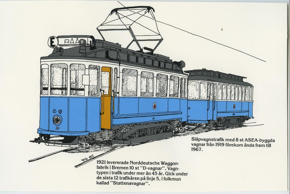Grafik med vit bakgrund och motiv föreställande en blå spårvagn. På spårvagnen finns skylt " E Råå". Tryckt text "Släpvagnstrafik med 8 st ASEA-byggda vagnar från 1919 förekom ända fram till 1967." och "1921 levererade Norddeutche Waggonfabrik i Bremen 10 st "D-vagnar". Vagntypen i trafik under mer ön 45 år. Gick under de sista 12 trafikpren på linje 5, i folkmun kallad "Stattenavagnar".
