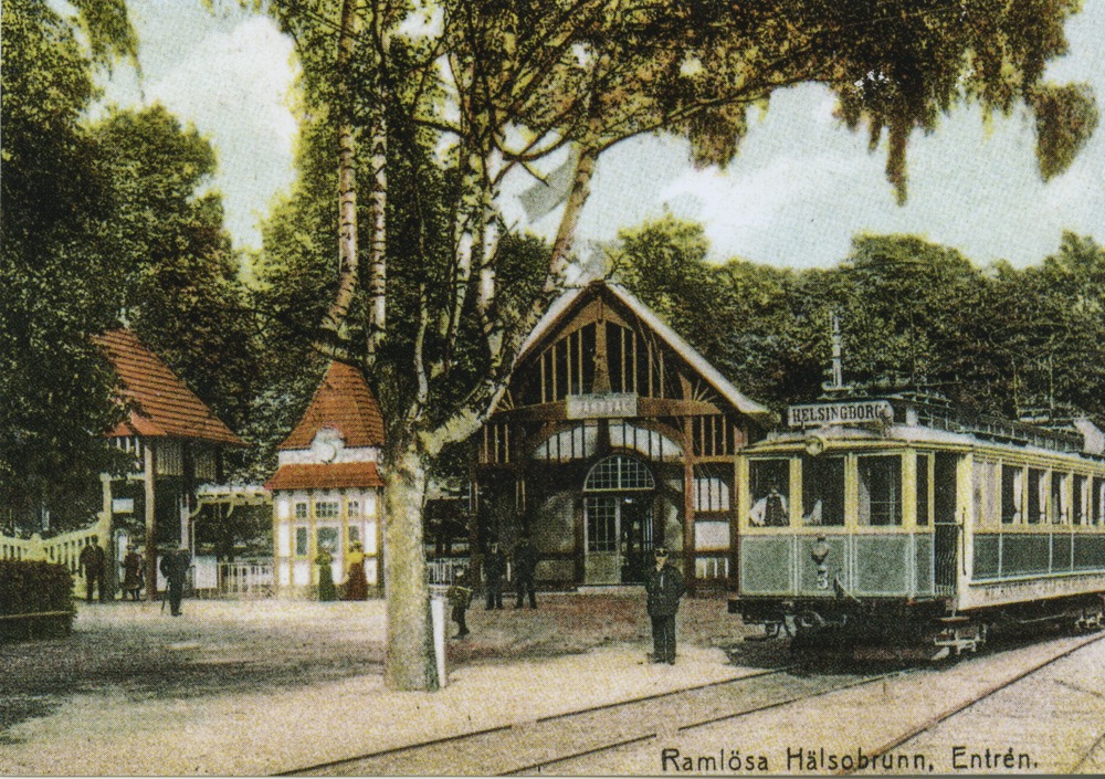 Vykort med tryck föreställande entrén till Ramlösa Hälsobrunn. Till höger syns en spårvagn med skylt "Helsingborg".