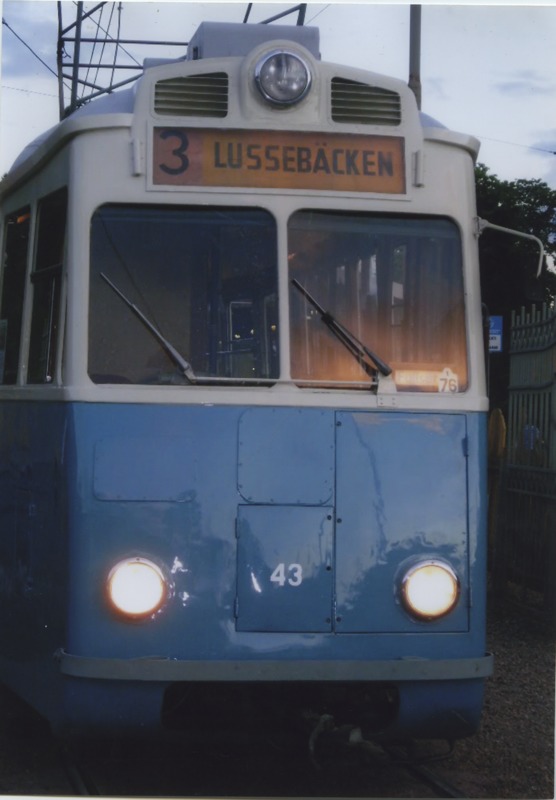 Fotografi föreställande en spårvagn fotograferad framifrån med skylten "3 Lussebacken". F-Vagn Mustang.