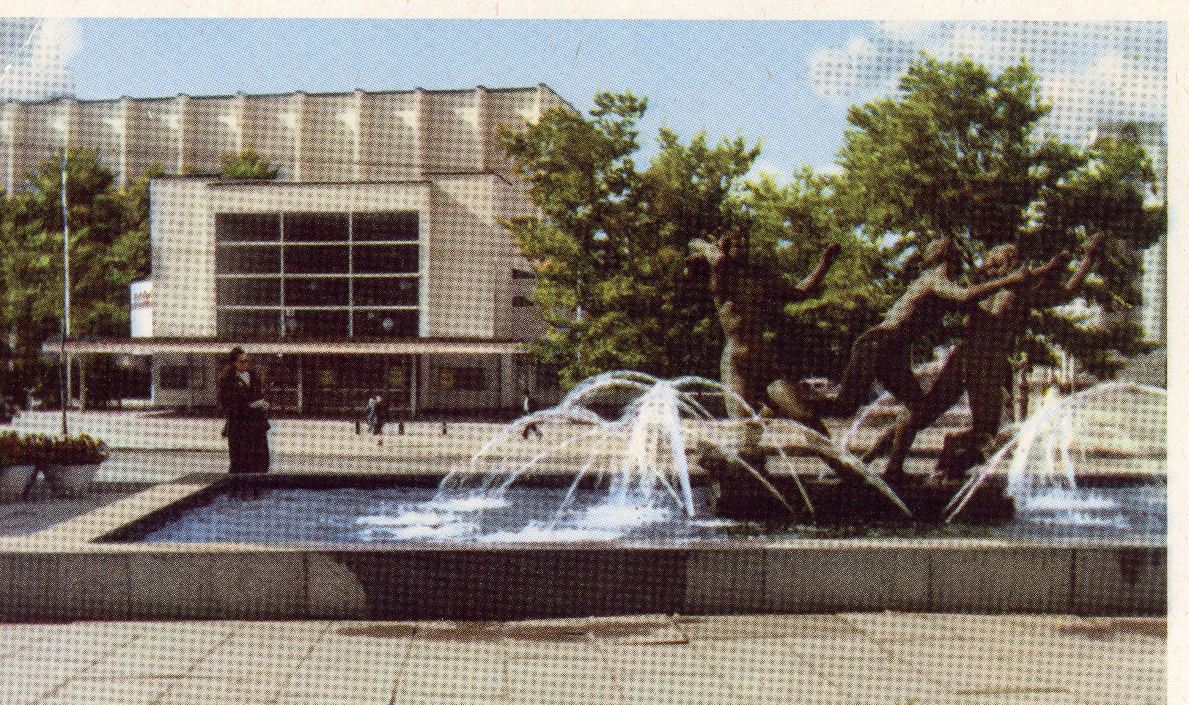 Bilden föreställer i förgrunden fontän och skulptur Lekande ungdom på S:t Jörgens plats. I bakgrunden Helsingborgs konserthus och några träd.
