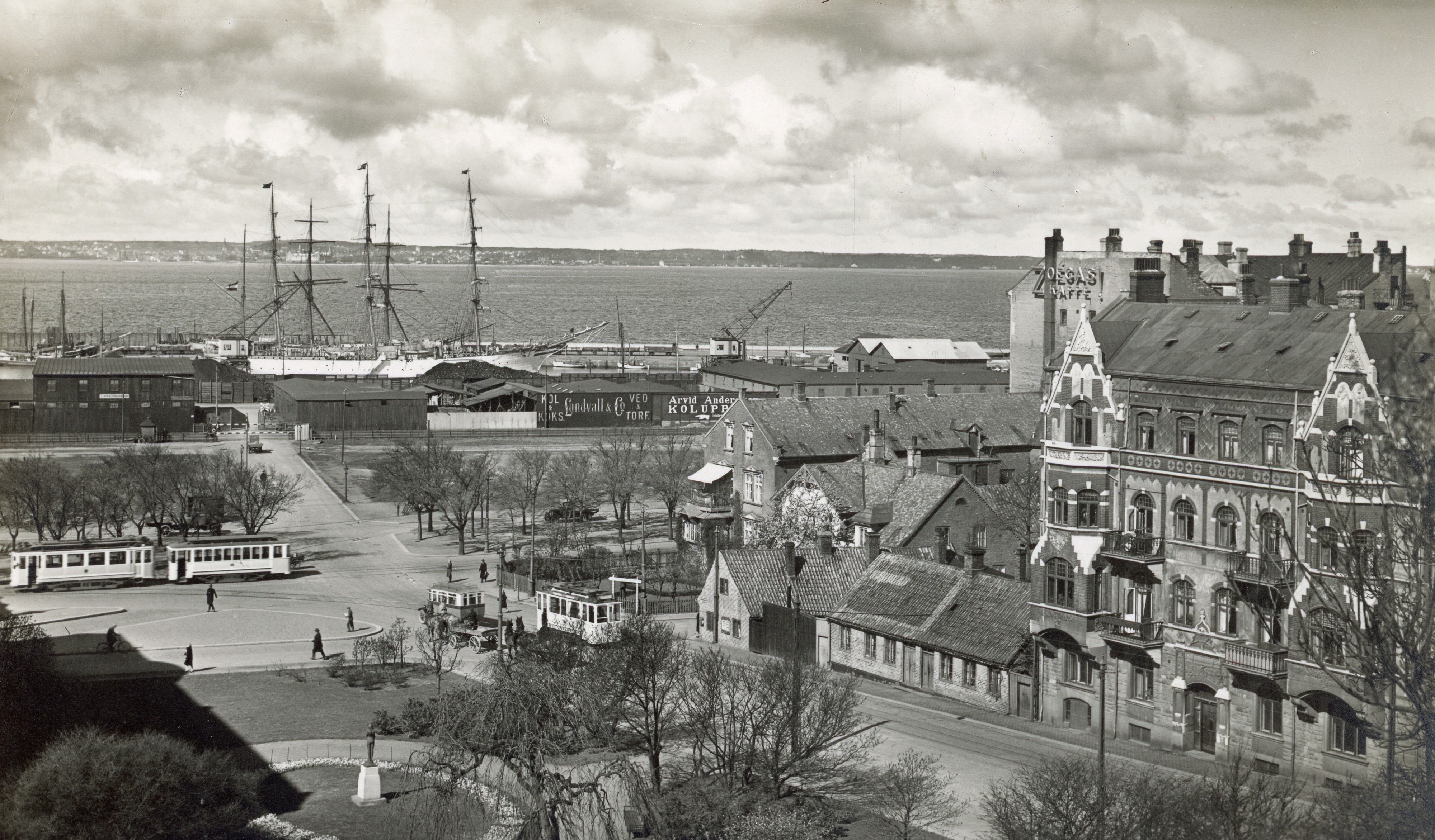 Bilden föreställer fågelperspektiv på St Jörgens plats i förgrunden med gräsmatta och träd. Platsen omges av gator med spårvagnar. Till höger flervåningshus och enplanshus. I bakgrunden träd och magasinsbyggnade, samt segelfartyg och Öresund.
