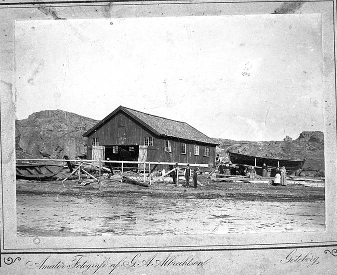 Medföljande text: "Bild från Brattås, Orust. Byggnaden på bilden ägdes av storbonden Anders Antonsson (byggnaden raserades 1938). På bilden syns från vänster: Julius Johansson (far till varvsägaren), Karl Johansson, Karl-Anton Johansson, Johannes Karlsson (arbetade vid varvet), Johanna (?), Maria (?), Maria Alexandersson och Anna-Helena Alexandersson. I ryggåsstugan längst uppe till höger i bild bodde "moster Britta". Bilden tagen på 1890-talet av G.A. Albrektsson, Göteborg. Originalfoto tillhörande Gösta Johansson, Kungsviken".