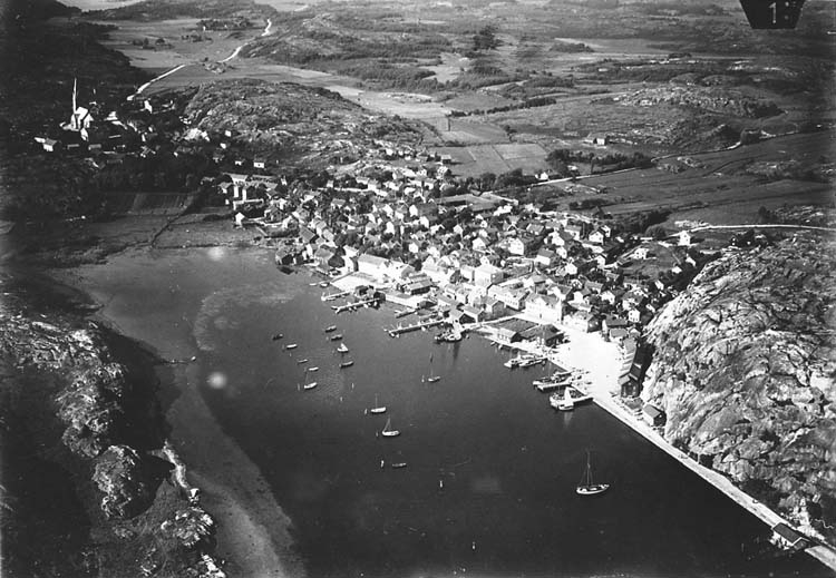 Medföljande text: "Vy över Grebbestad 1927. F Oscar Bladh".