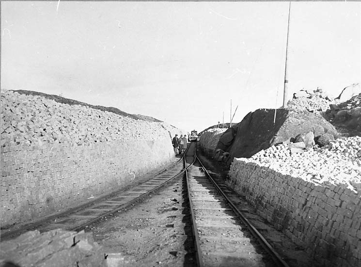 Medföljande text: "Gulldalen. Järnväg mellan stenbrotten och utlastningsplatsen i Grönvik. 1930-talet".