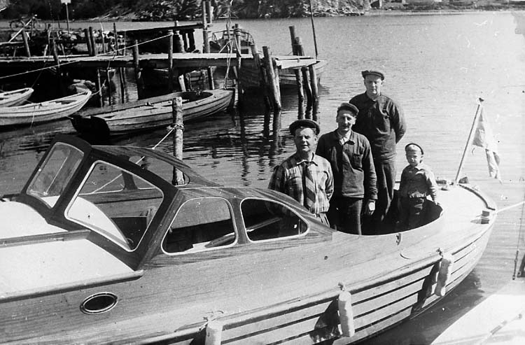 Medföljande text: "Bohussnipa, beställd av Sven Johansson, Vänersborg. I båten syns från vänster: Gustav Johansson, Abel Johansson (bröder), okänd, samt Gustav Johanssons son Klas. Bilden tagen år 1957. Originalfoto tillhörande Abel Johansson".