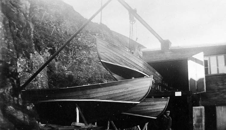 Medföljande text: "Myrens Mekaniska Verkstad, Strömstad. På bilden syns Långedragsjullar byggda vid verkstaden. Till höger i bilden snickarverkstaden.