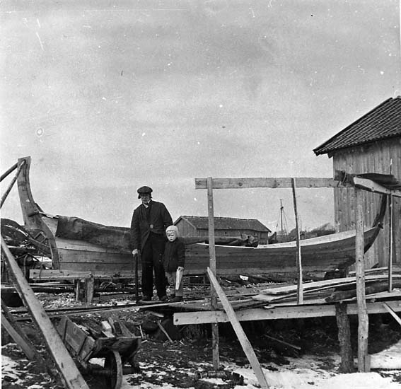 Medföljande text: "Byggnation av en 24 fots snäcka på Koster. På bilden (till vänster) syns båtbyggaren, Anders Hansson. Bilden tagen på 1950-talet. Originalfoto tillhörande Carl Johan Hansson, Koster".