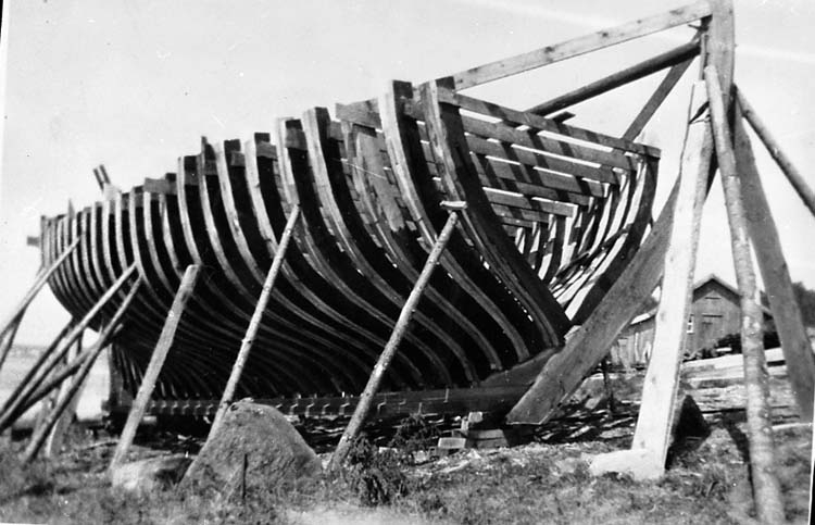 Medföljande text: "Trålare under byggnad på Råssö år 1947 (se även 61:4 R 66:2), På bilden syns de resta spanten. Trålaren byggdes av Iwan Jonasson, Karl-Wilhelm Jonasson och Jonas Jonsson, samtliga boende på Råssö. Originalfoto tillhörande Iwan Jonasson, Råssö".