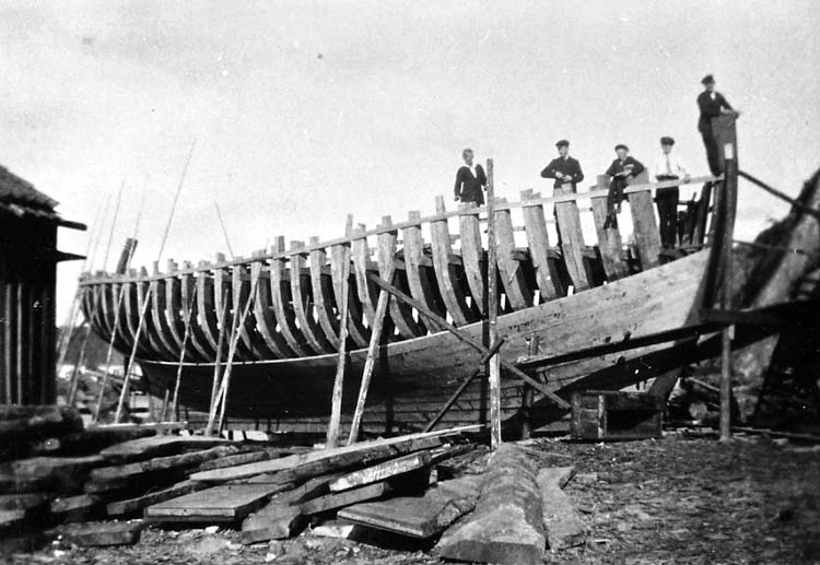 Medföljande text: "Myrens Mekaniska Verkstad, Strömstad. Fraktfartyget "Norrviken" under byggnad (se även R 59:2, R 59:3, R 60:2, R 60:3). Fr v syns Karl-Erik Andersson, Gunnar Antonsson (arbetade senare vid Myrens Mekaniska Verkstad som smed), Erik Antonsson, Arne Ljungqvist och Jarl Andersson. Bilden tagen 1931-1932. Originalfoto tillhörande Allan Ljungqvist, Strömstad".